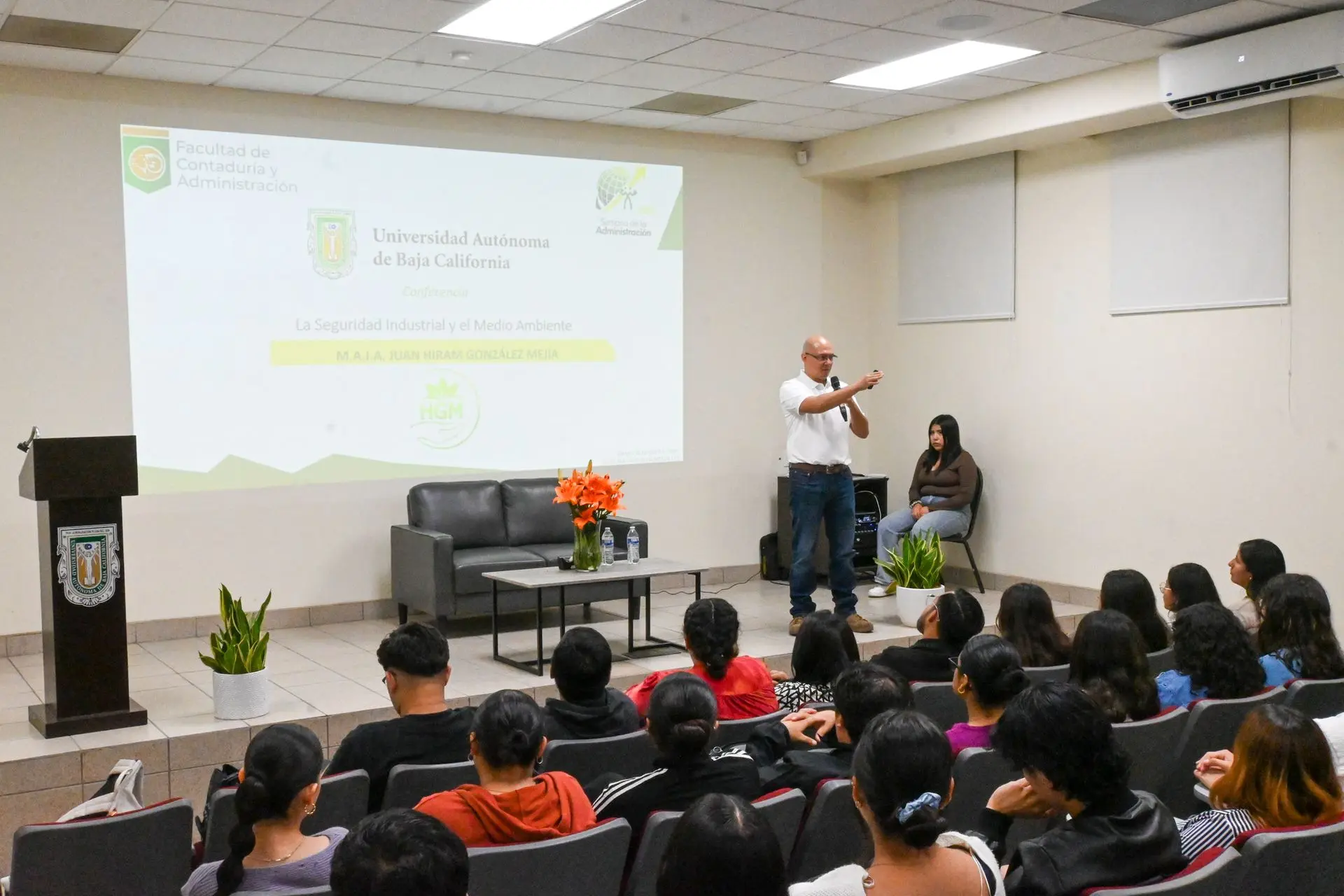 Dentro del marco de la Semana de Administración 2025, se llevó a cabo la conferencia “La Seguridad Industrial y el Medio Ambiente”, un espacio académico que reunió a estudiantes, docentes y profesionistas interesados en fortalecer sus conocimientos sobre la importancia de generar entornos laborales seguros y sostenibles. La actividad formó parte del programa de conferencias y talleres que buscan enriquecer la formación integral del estudiantado, vinculando los temas de la administración con la responsabilidad social, la prevención de riesgos y la protección ambiental. La conferencia fue impartida por el M.A.I.A. Juan Hiram González Mejía, quien compartió su experiencia y perspectivas sobre la aplicación de políticas y estrategias de seguridad industrial en diversos sectores productivos, destacando la relevancia de la gestión ambiental como un factor clave para la competitividad y el desarrollo sustentable de las organizaciones. Su intervención permitió reflexionar sobre la necesidad de integrar prácticas responsables que garanticen el bienestar de las personas y la preservación de los recursos naturales, alineándose con los retos actuales de la administración moderna.