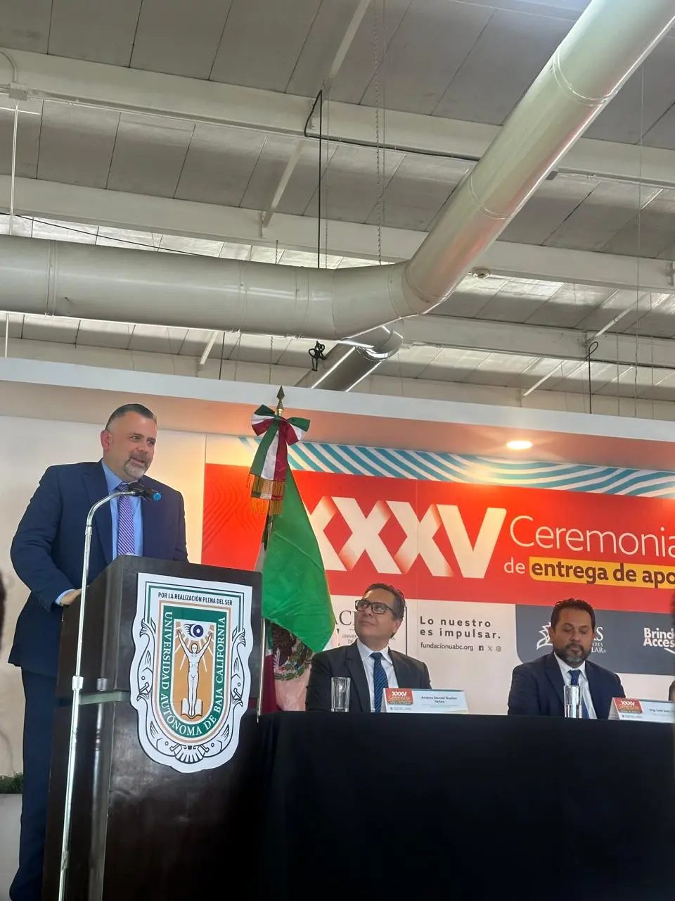 Celebramos a nuestras y nuestros estudiantes Emmanuel Bahena Avelino, Kevin Antonio López Bentancourt y Valeria Aguayo Rivera, quienes recibieron becas y equipo de cómputo por parte de Fundación UABC durante la ceremonia de entrega 2025.