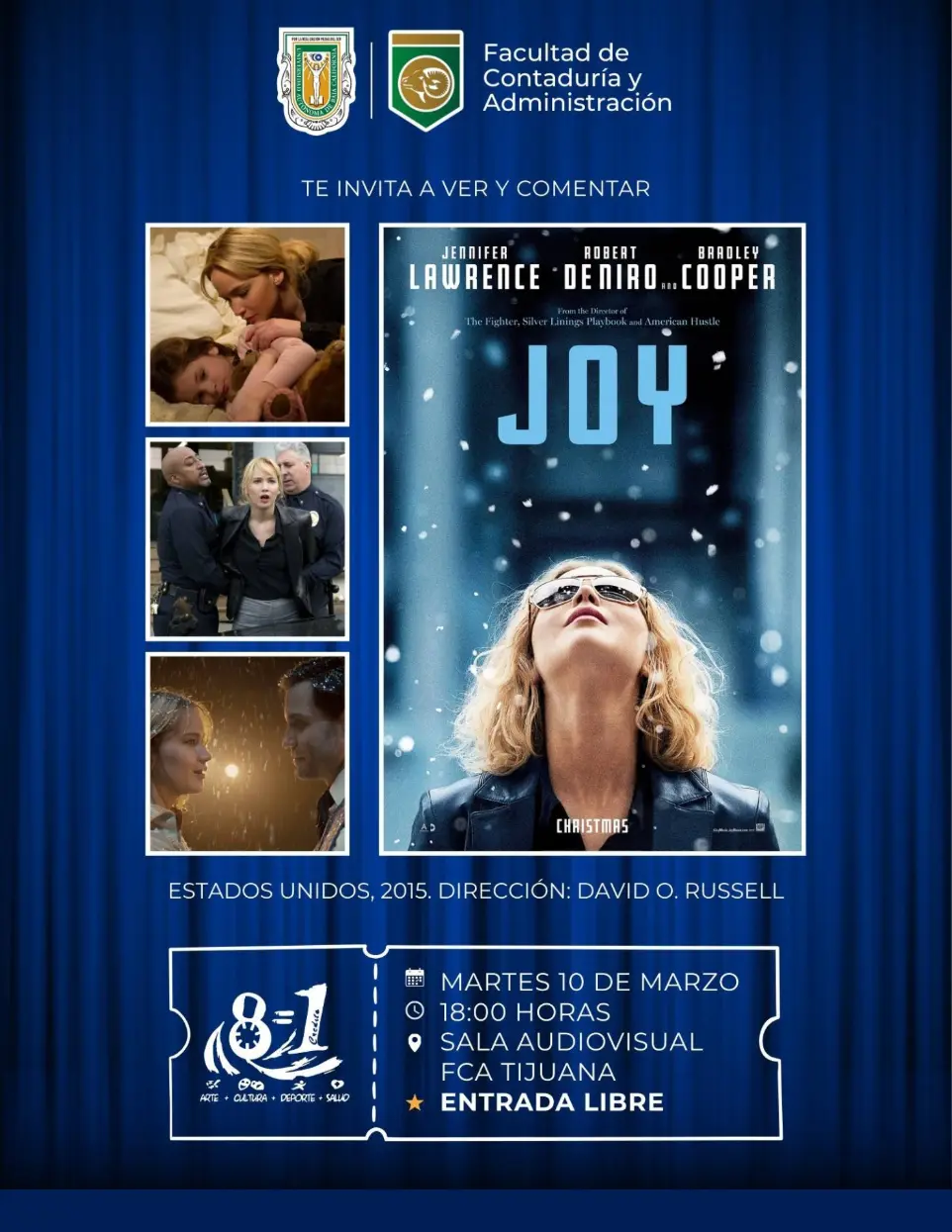 En el marco del Día Internacional de la Mujer, la FCA te invita a la proyección y espacio de reflexión de la película Joy, una comedia dramática biográfica que retrata la historia de perseverancia y emprendimiento de una mujer que desafió las adversidades para alcanzar el éxito.