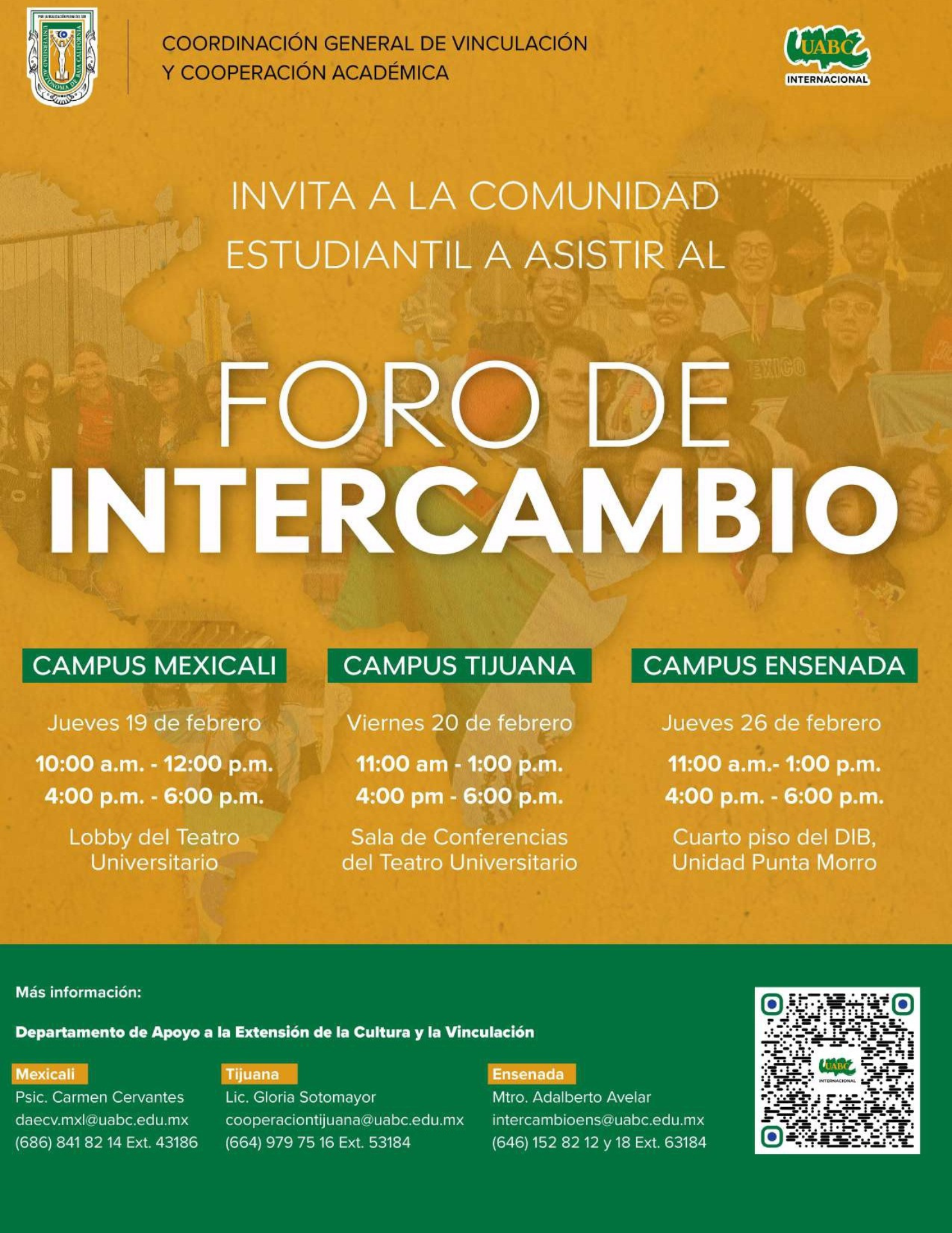 La Coordinación General de Vinculación y Cooperación Académica te invita cordialmente a asistir al Foro de Intercambio Estudiantil, un espacio diseñado para que conozcas todas las oportunidades de movilidad nacional e internacional que tenemos para ti.