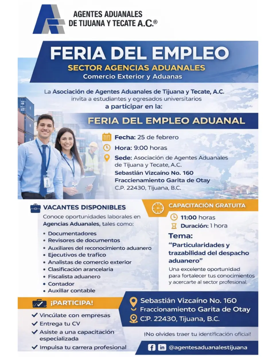 La Asociación de Agentes Aduanales de Tijuana y Tecate, A.C. invita a todos los estudiantes y egresados a participar en su próxima Feria del Empleo.